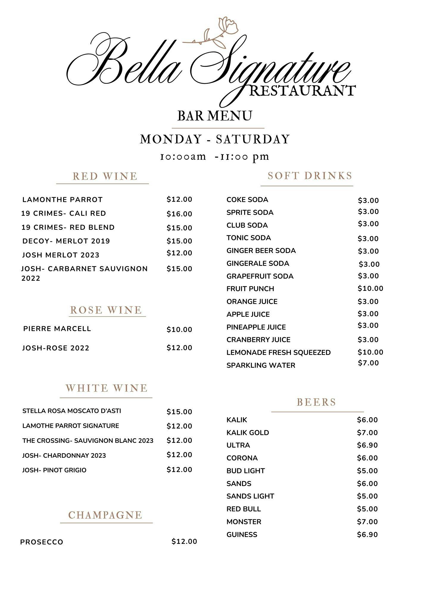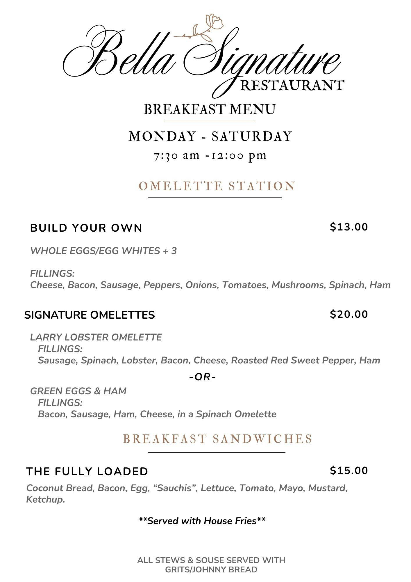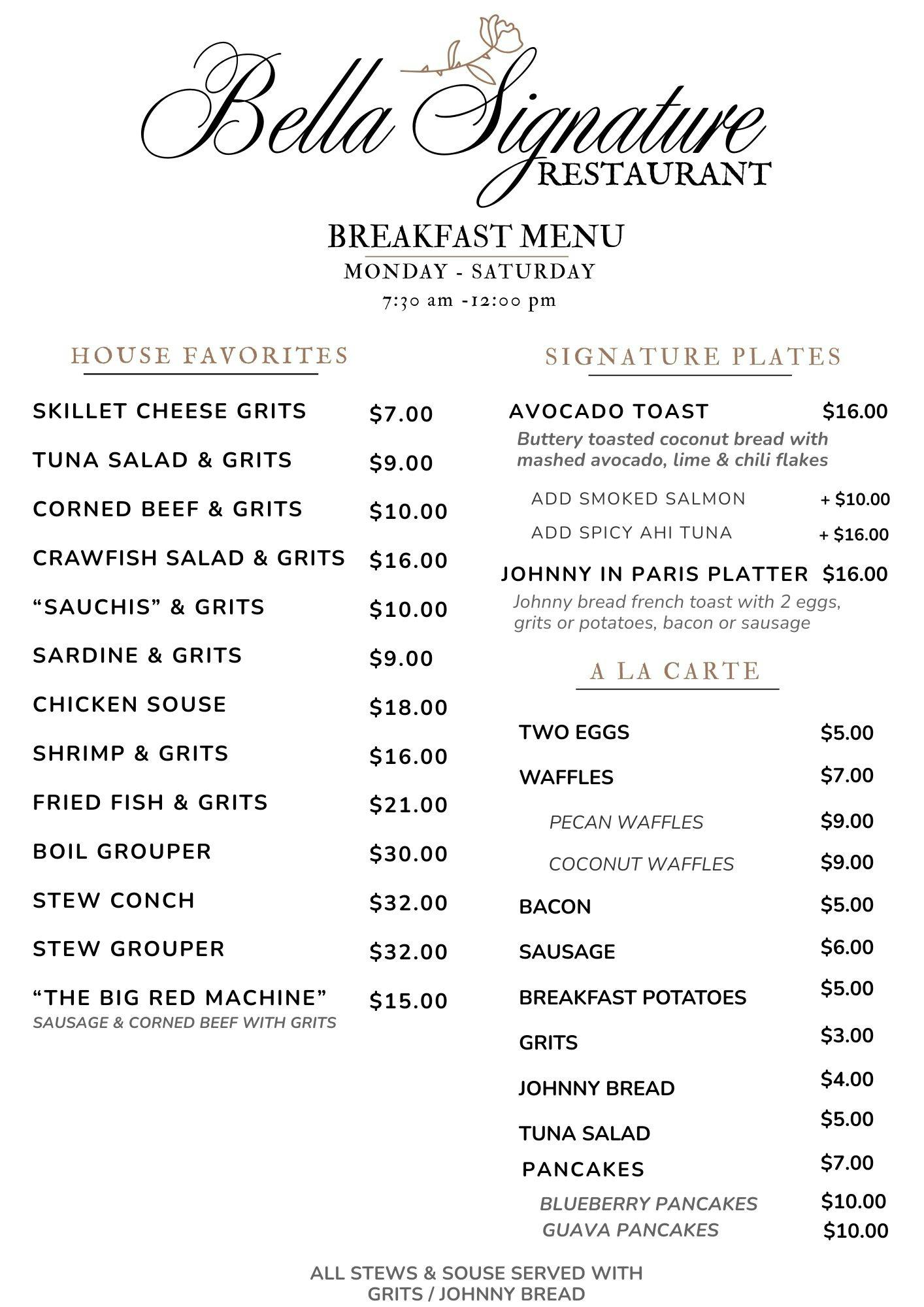 Whether you’re joining us for a quiet morning, a lively dinner, or a weekend celebration, Bella Signature offers an experience that combines refined dining with the warmth of true Bahamian hospitality.