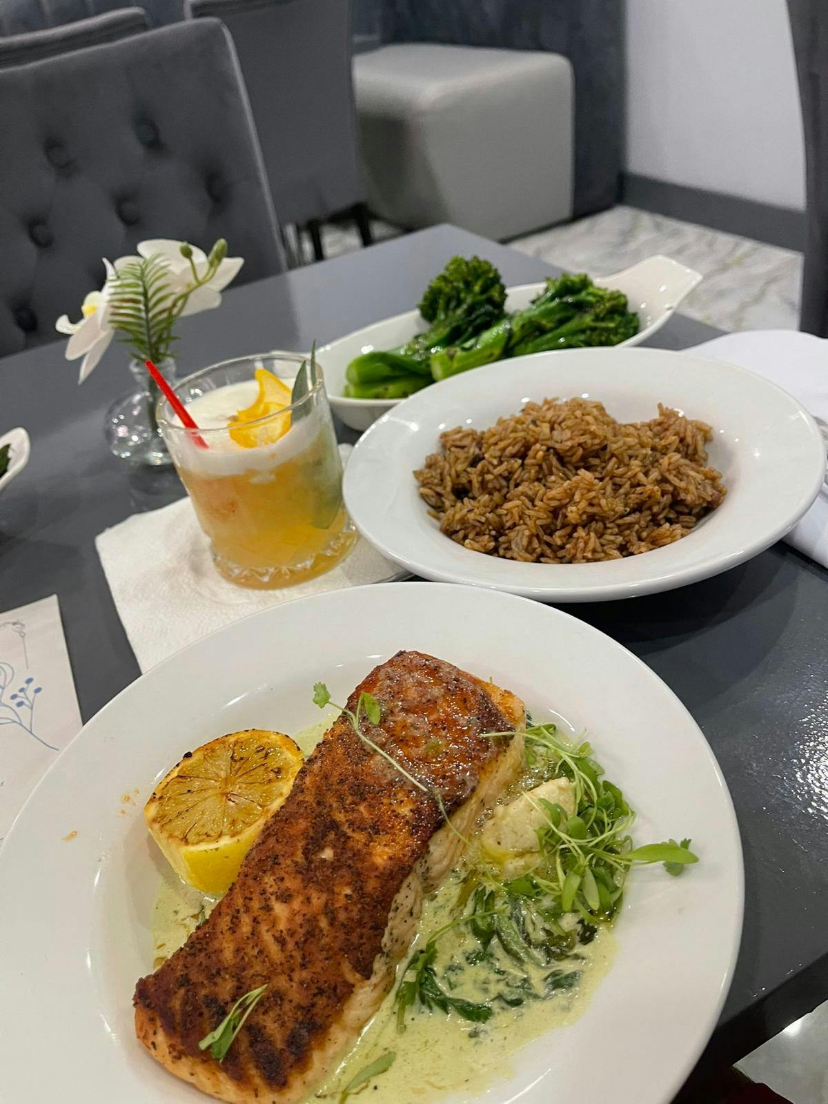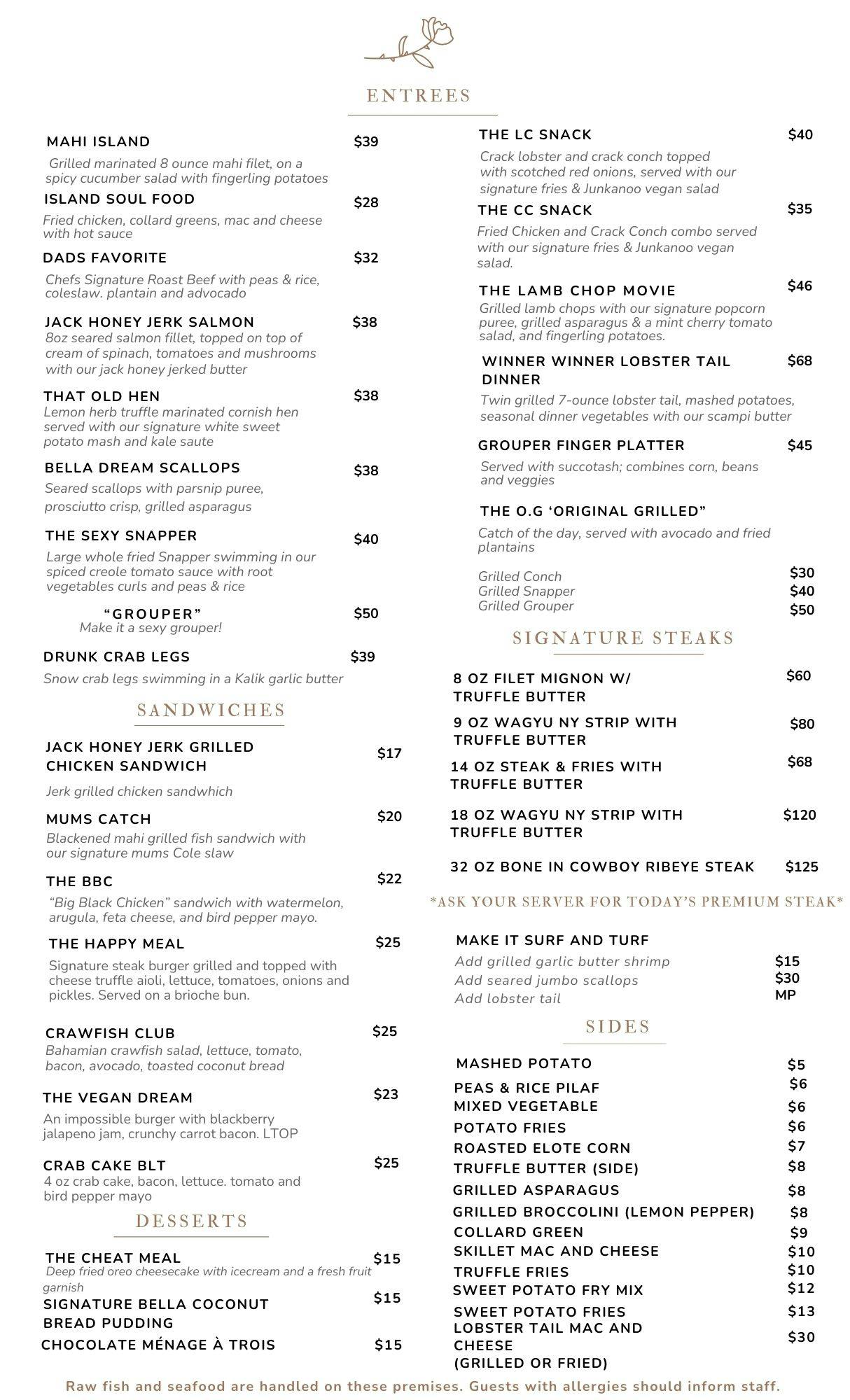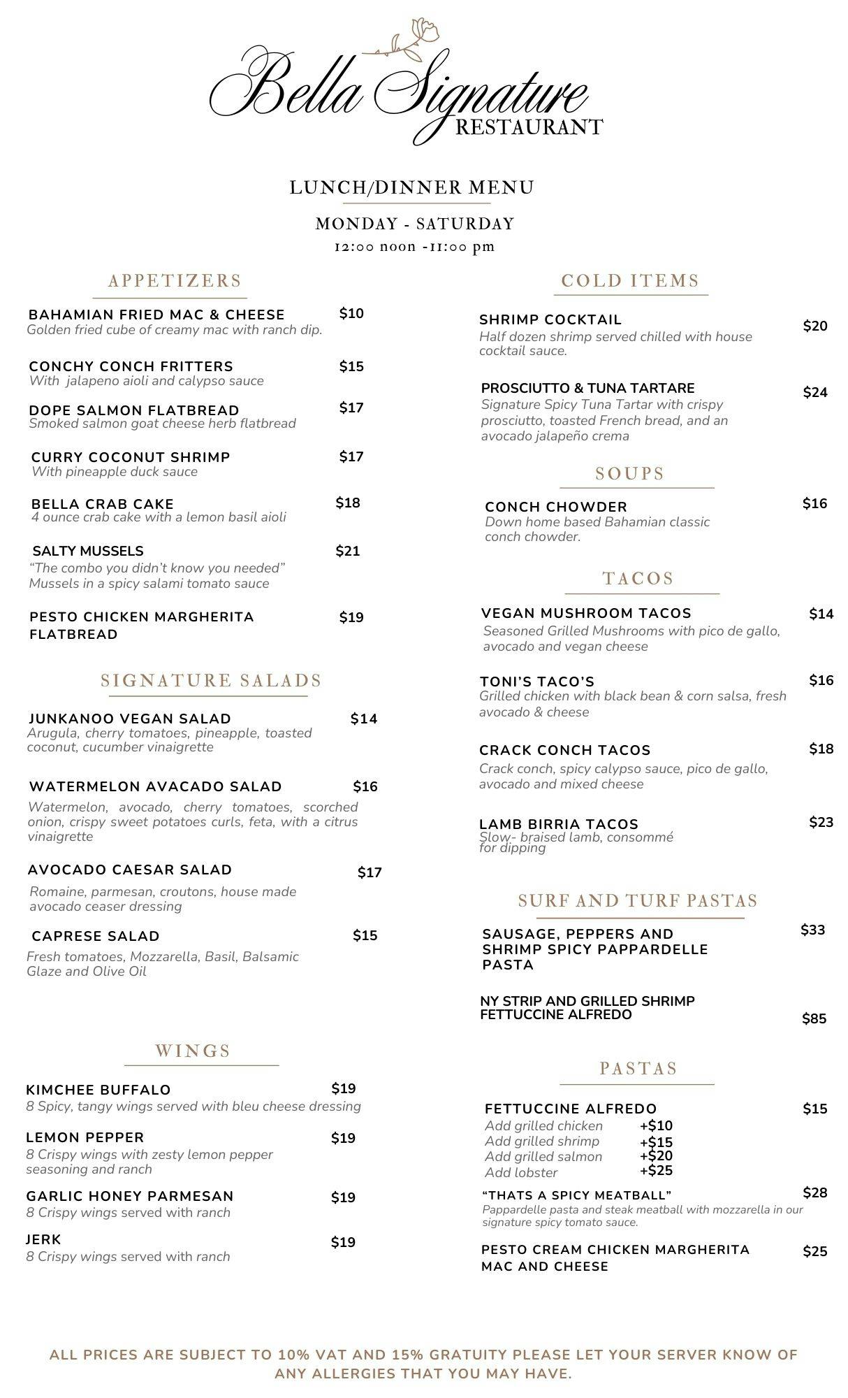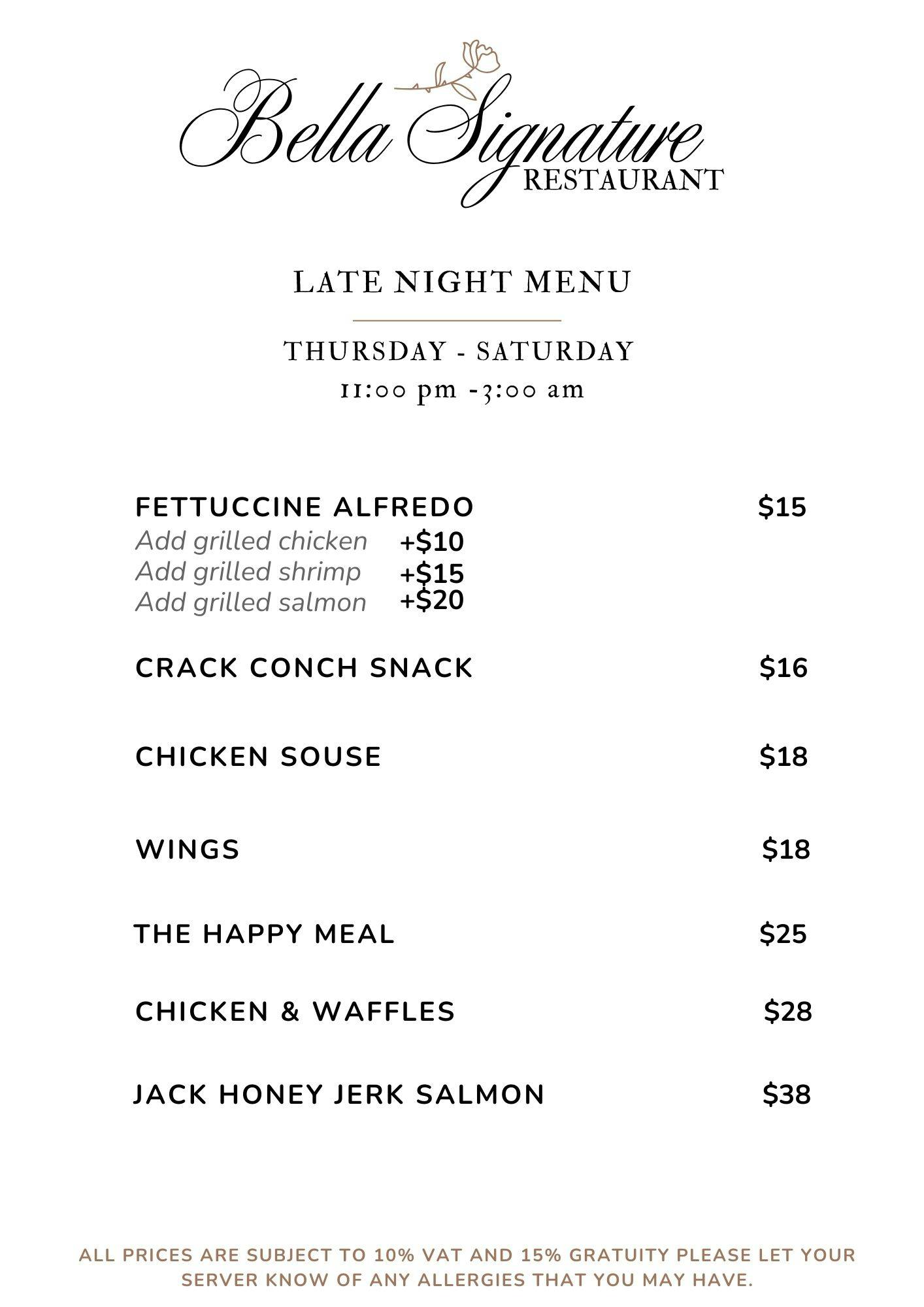 Welcome to Bella Signature Restaurant — where Bahamian flavors meet modern sophistication. Every dish is thoughtfully crafted to elevate island favorites into something unforgettable. From the rich, smoky glaze of our Jack Honey Jerk Salmon to the signature flavor of our Sexy Snapper, each plate is a reflection of creativity, passion, and island pride.